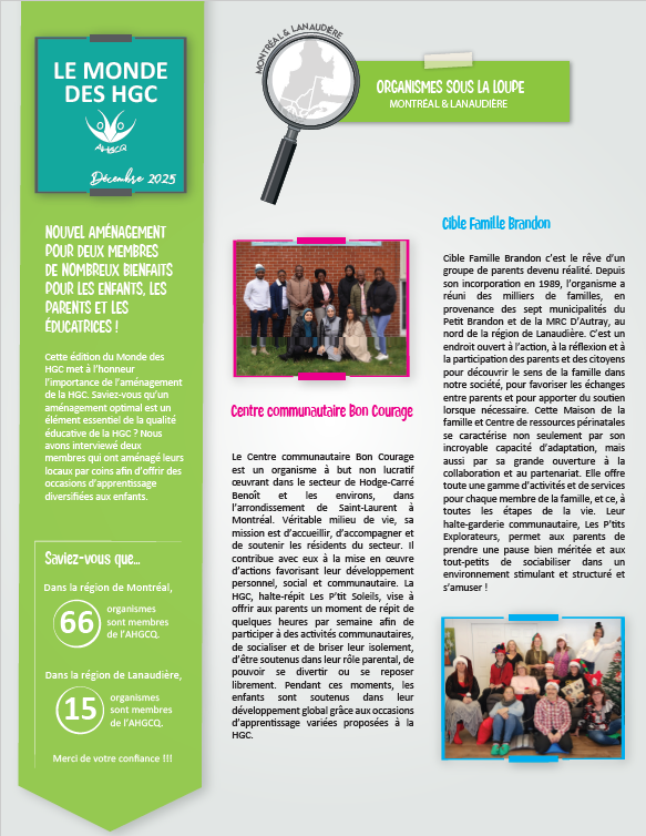 Le Programme éducatif Je grandis en halte-garderie communautaire a été conçu par l’Association des haltes-garderies communautaires du Québec (AHGCQ) afin de favoriser la qualité éducative en halte-garderie communautaire (HGC). Il reconnaît l’enfant comme un être unique jouant un rôle actif dans son développement. L’AHGCQ s’est appuyée sur les principes, les valeurs et les fondements théoriques des approches pédagogiques et des données issues des recherches en petite enfance.